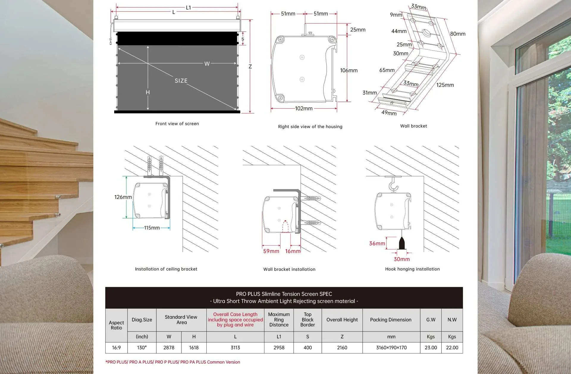 • Pro P – For UST Projector Placed at the Bottom Of the Screen, with Acoustic Transparent Border at the Top